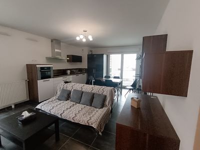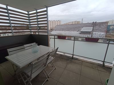 Réf. 1360 - A louer F3 MEUBLE de 62.65 m2 au 2ème étage comprenant : Entrée, pièce à vivre avec cuisine équipée, deux chambres, deux terrasses, salle de douche, wc indépendant. Chauffage individuelle au gaz